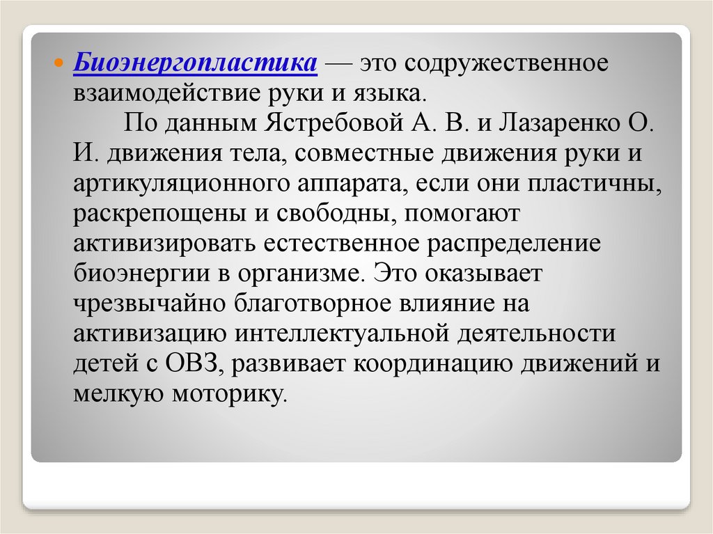 Биоэнергопластика — это содружественноевзаимодействие руки и языка.