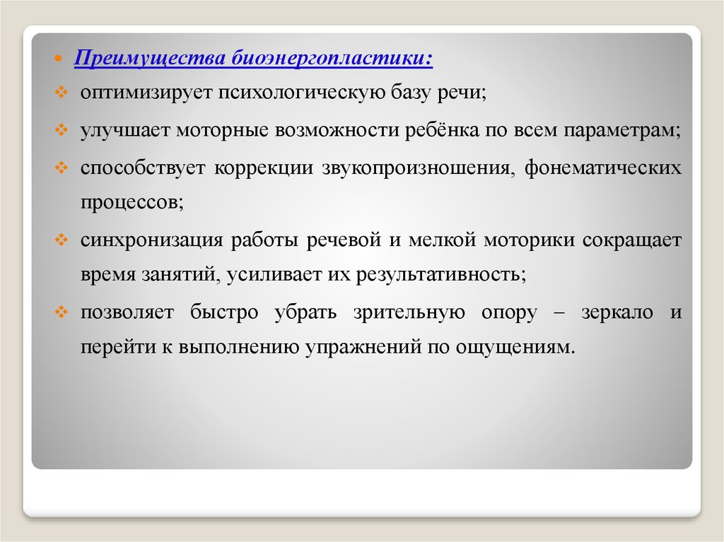 Преимущества биоэнергопластики:оптимизирует психологическую базу речи;