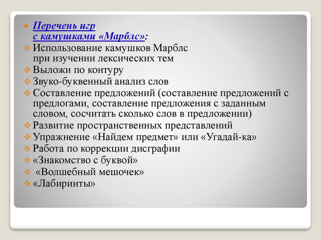 Перечень игрс камушками «Марблс»:
