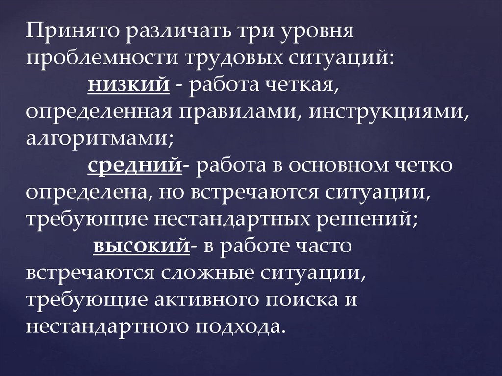 Принято различать три уровняпроблемности трудовых ситуаций:
