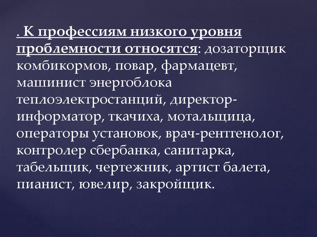 . К профессиям низкого уровняпроблемности относятся: дозаторщик