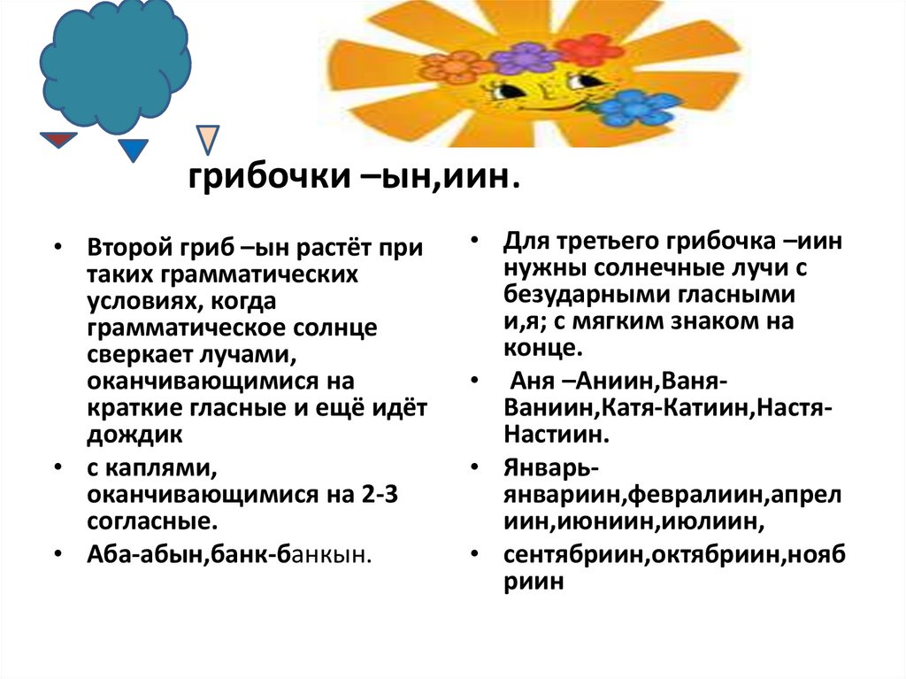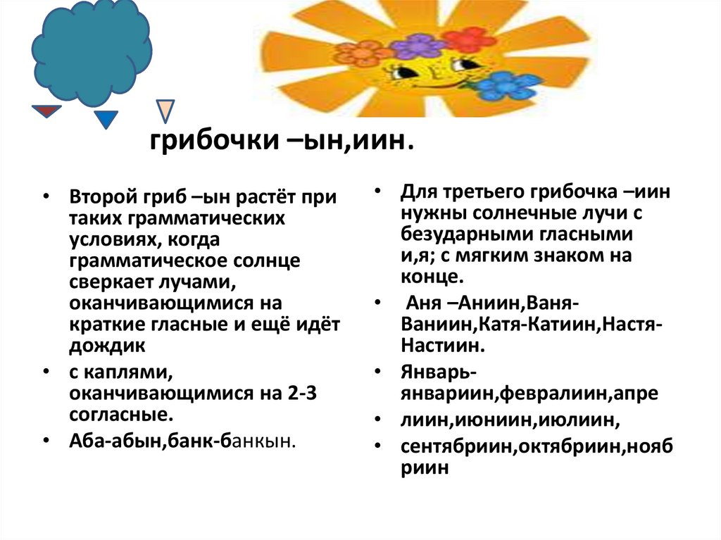 -иинДля третьего грибочка –иин нужны солнечные лучи с