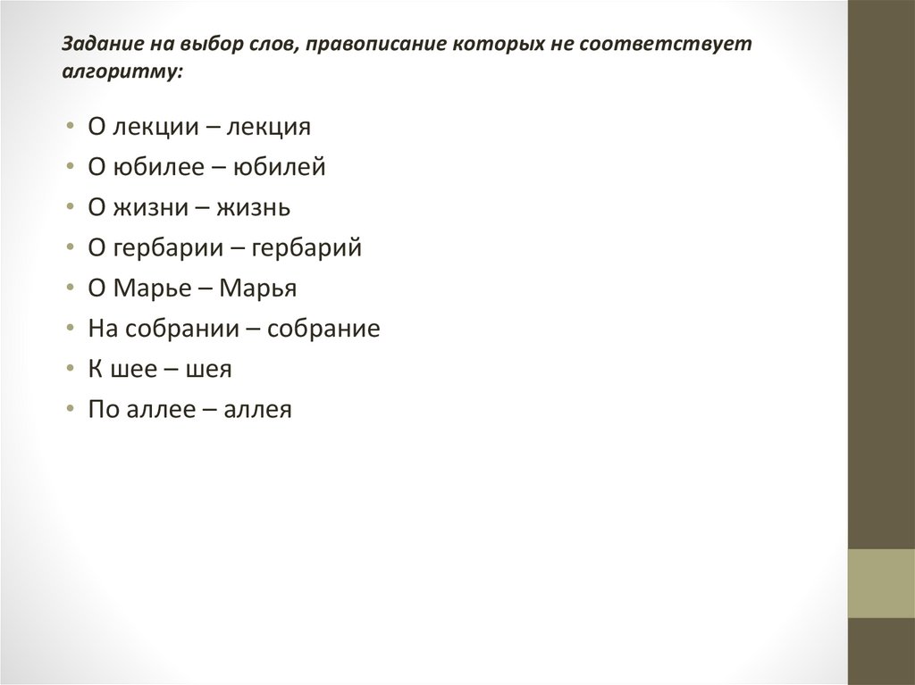 Задание на выбор слов, правописание которых не соответствуеталгоритму: