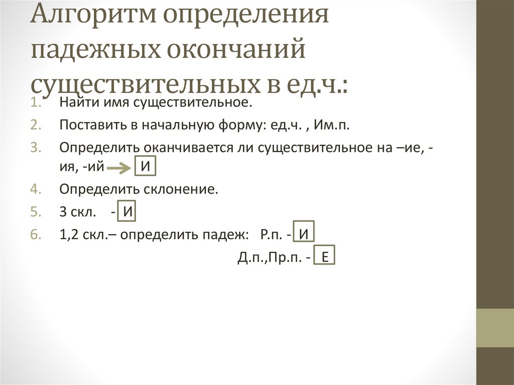 Алгоритм определения падежныхокончаний существительных в ед.ч.: