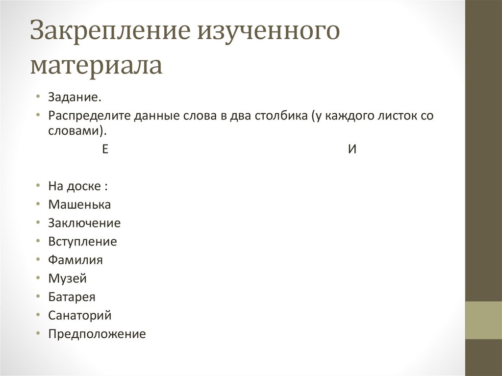 • Распределите данные слова в два столбика (у каждого листок со