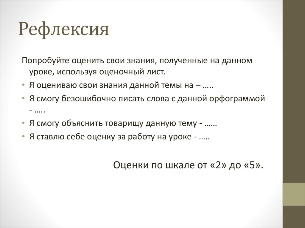 • Я оцениваю свои знания данной темы на – …..