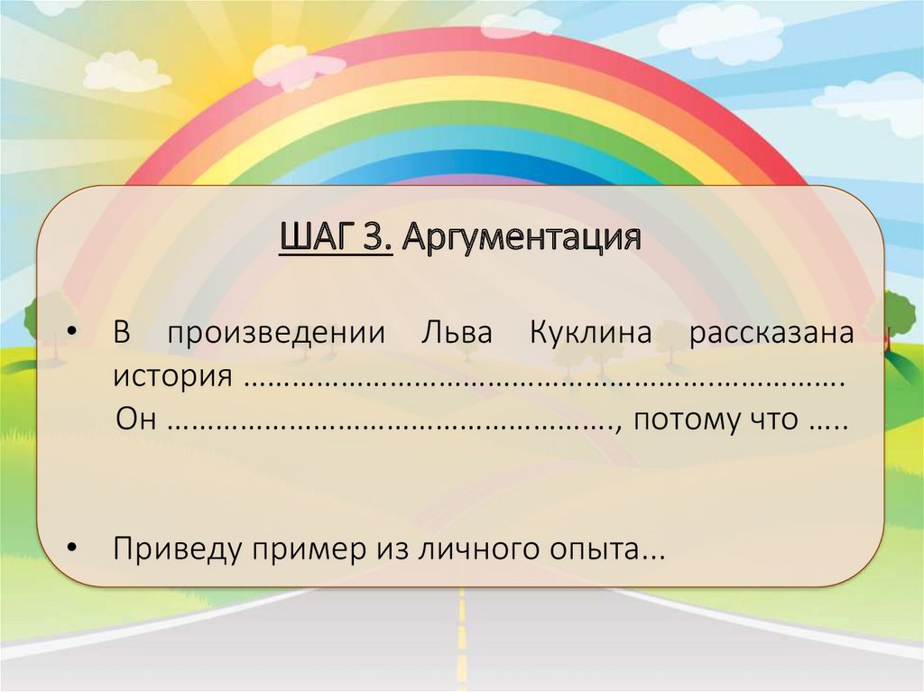 ШАГ 3. Аргументация• В произведении Льва Куклина рассказана