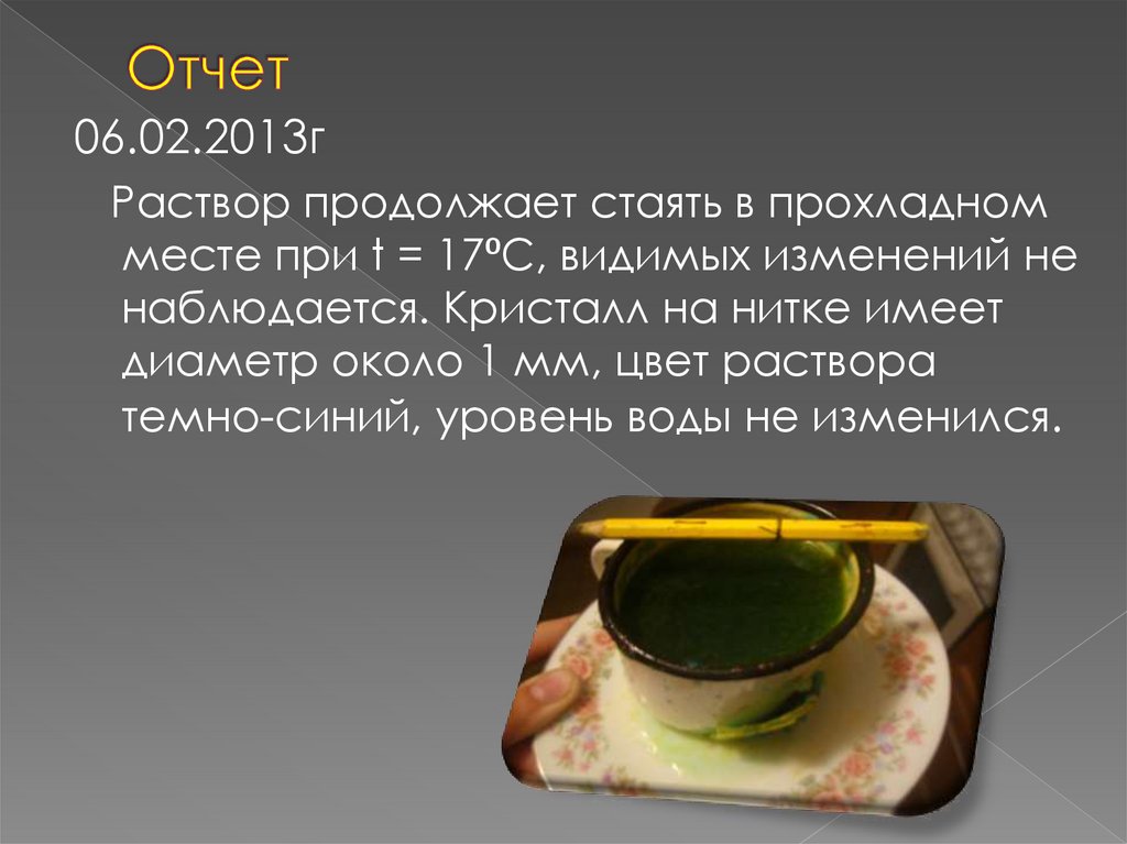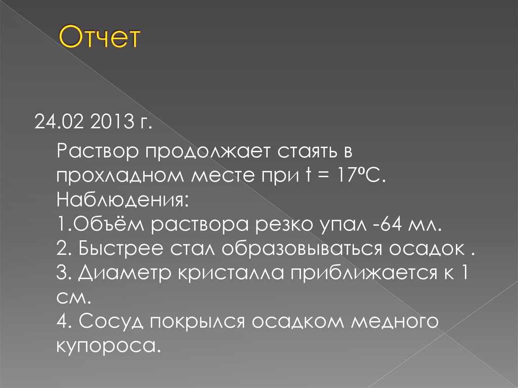 Раствор продолжает стаять впрохладном месте при t = 17⁰C.