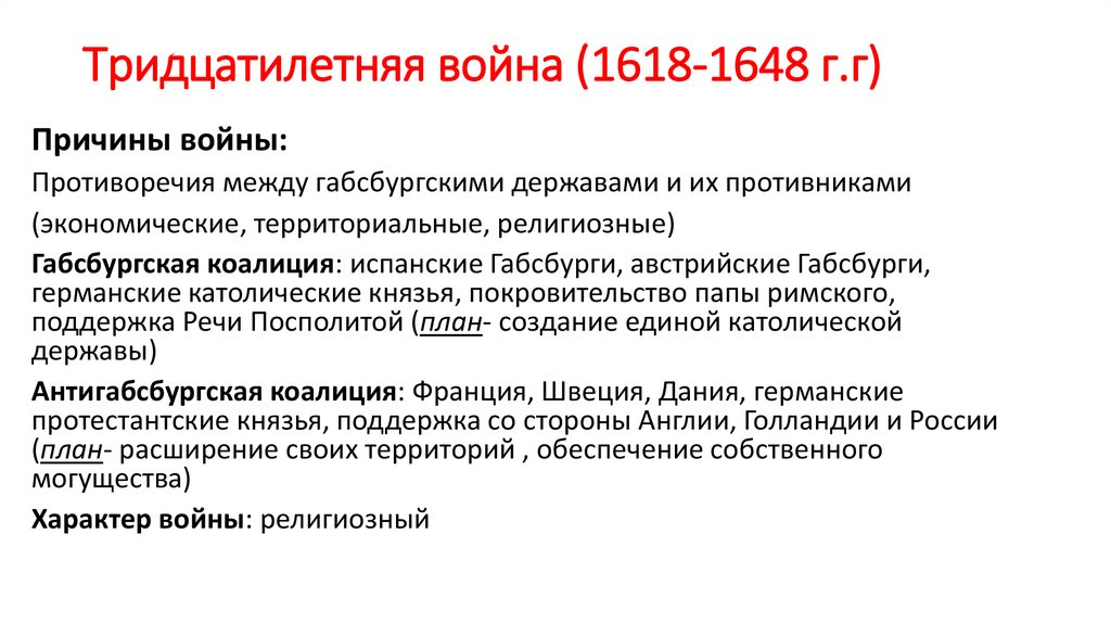 Тридцатилетняя война (1618-1648 г.г)Причины войны: