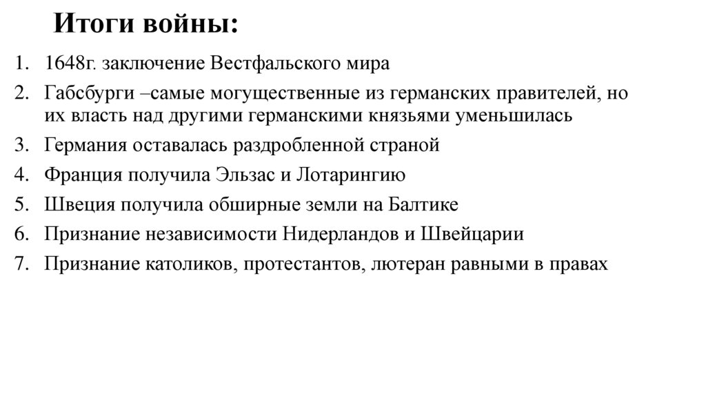 Итоги войны:1. 1648г. заключение Вестфальского мира