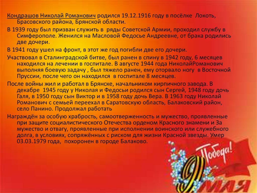 Кондрашов Николай Романович родился 19.12.1916 году в посёлке Локоть,Брасовского района, Брянской области.