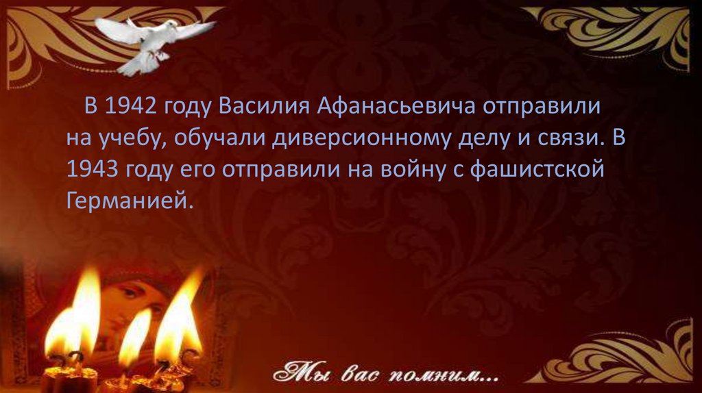 В 1942 году Василия Афанасьевича отправилина учебу, обучали диверсионному делу и связи. В