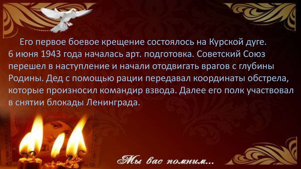 Его первое боевое крещение состоялось на Курской дуге.6 июня 1943 года началась арт. подготовка. Советский Союз