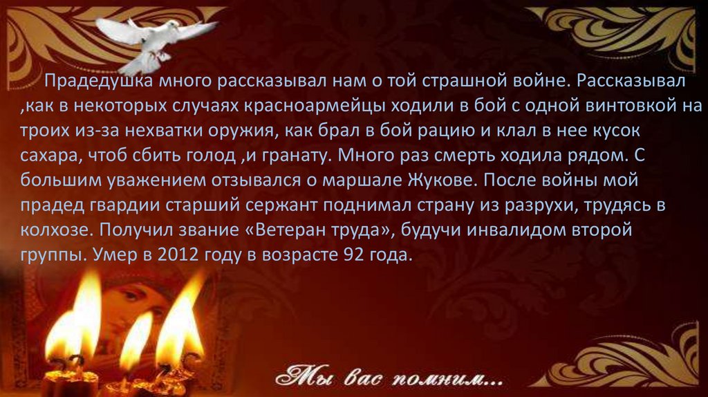 Прадедушка много рассказывал нам о той страшной войне. Рассказывал,как в некоторых случаях красноармейцы ходили в бой с одной винтовкой на