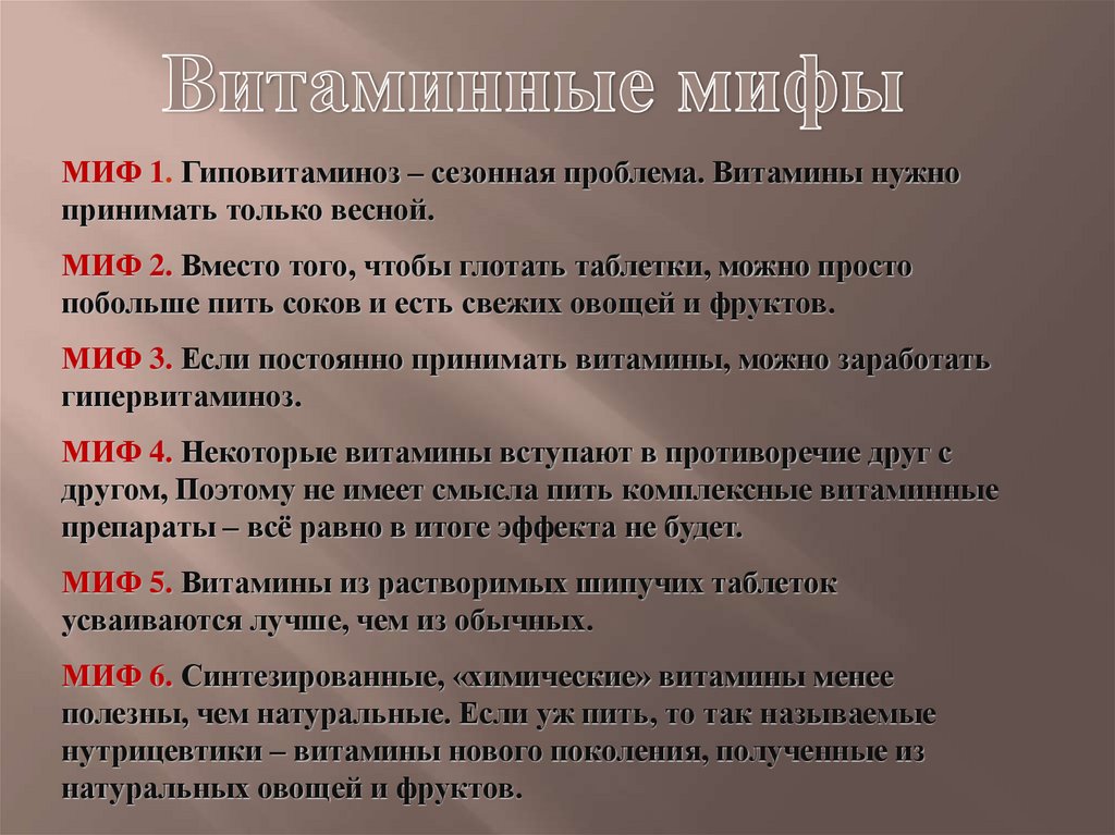 МИФ 1. Гиповитаминоз – сезонная проблема. Витамины нужнопринимать только весной.