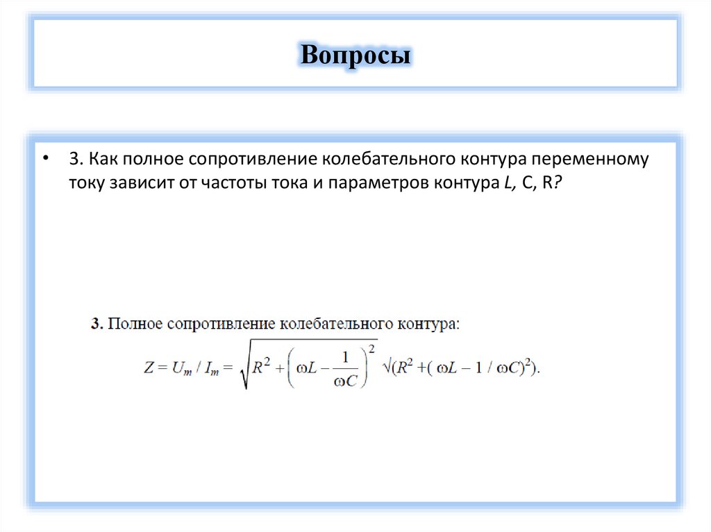 Вопросы• 3. Как полное сопротивление колебательного контура переменному