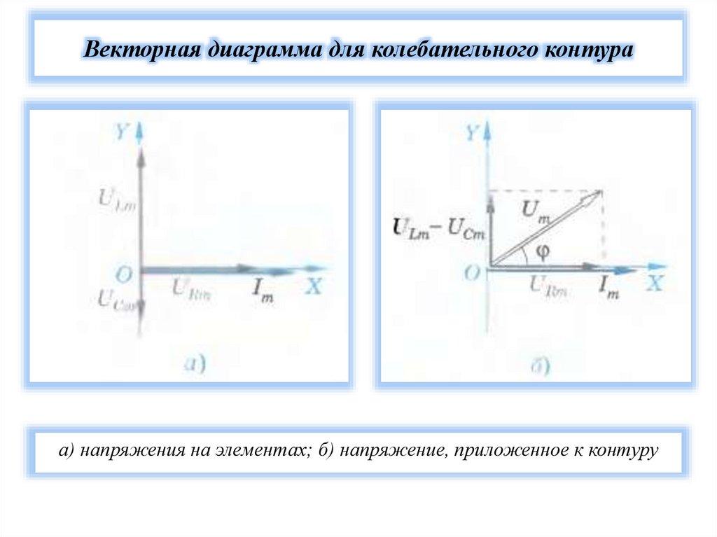 Векторная диаграмма для колебательного контураа) напряжения на элементах; б) напряжение, приложенное к контуру