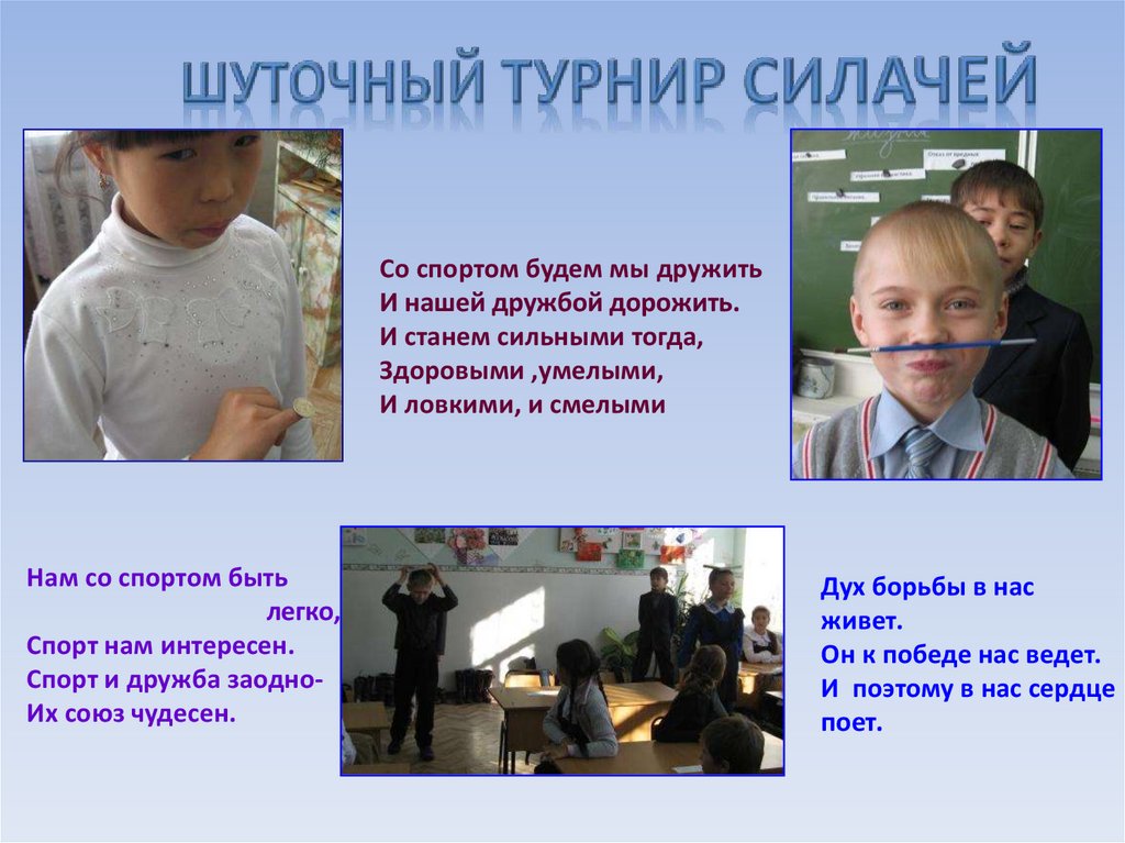Со спортом будем мы дружитьИ нашей дружбой дорожить.
