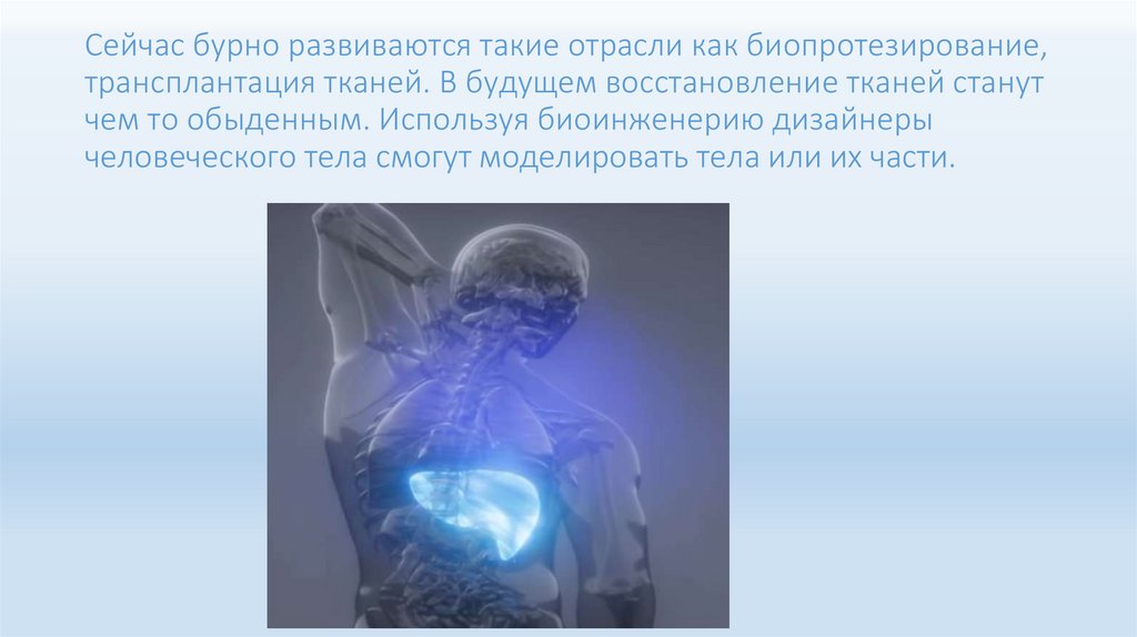 Сейчас бурно развиваются такие отрасли как биопротезирование,трансплантация тканей. В будущем восстановление тканей станут
