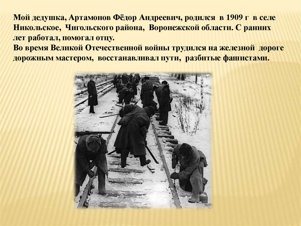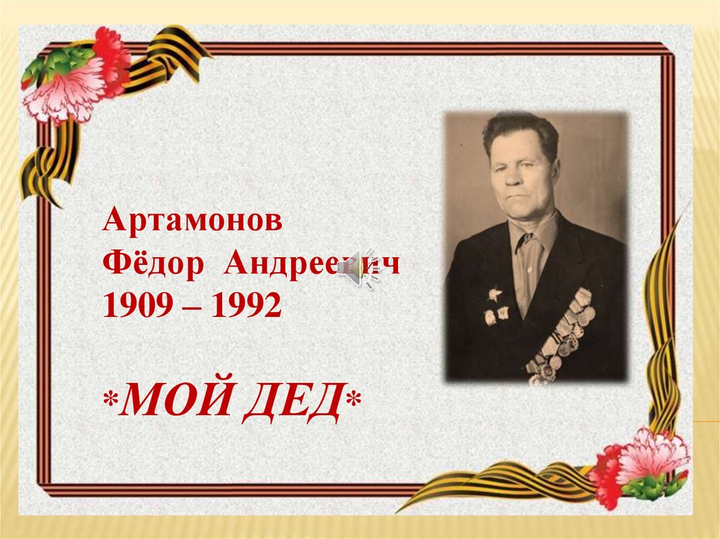 Мой дедушка, Артамонов Фёдор Андреевич, родился в 1909 г в селеНикольское, Чигольского района, Воронежской области. С ранних