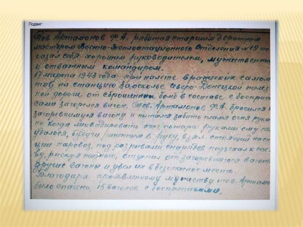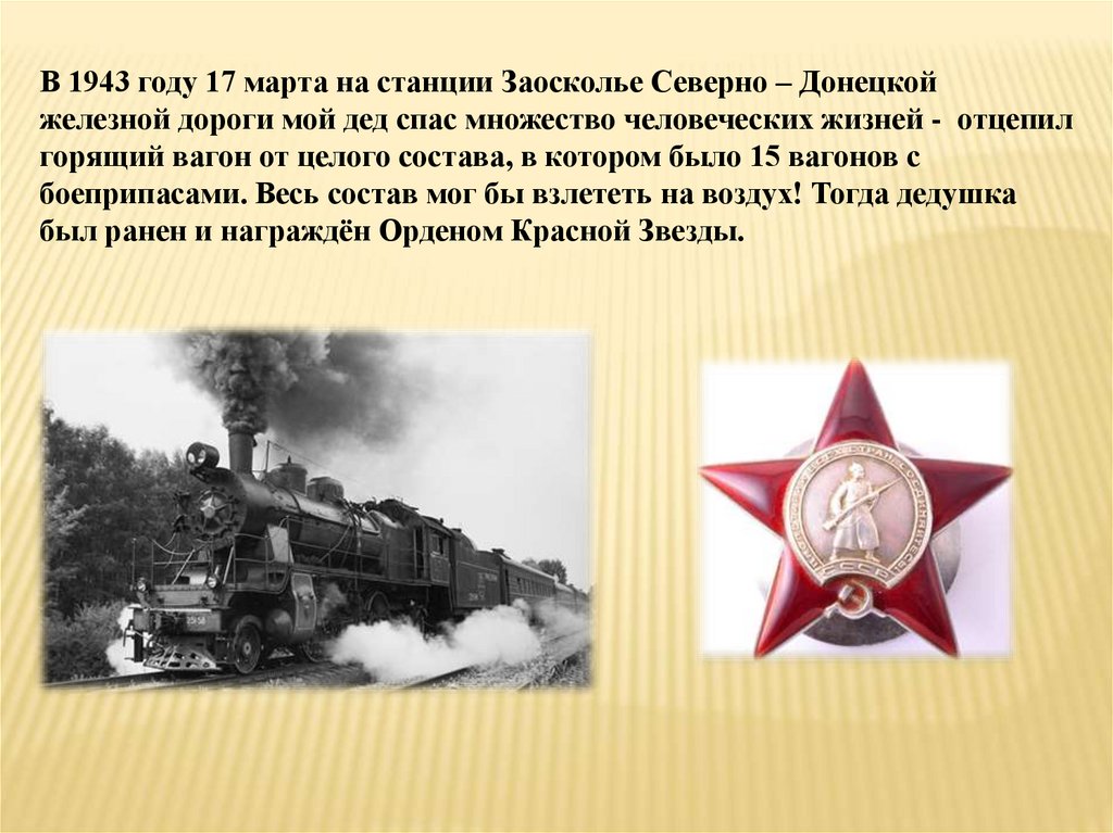 В 1943 году 17 марта на станции Заосколье Северно – Донецкойжелезной дороги мой дед спас множество человеческих жизней - отцепил