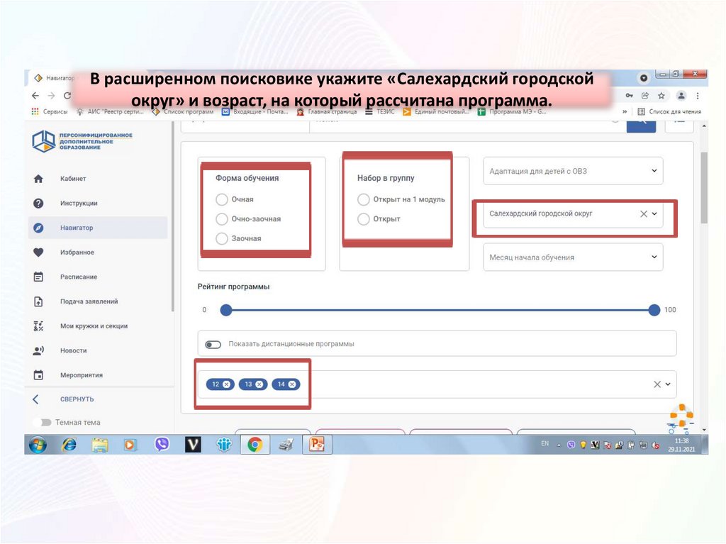 В расширенном поисковике укажите «Салехардский городскойокруг» и возраст, на который рассчитана программа.