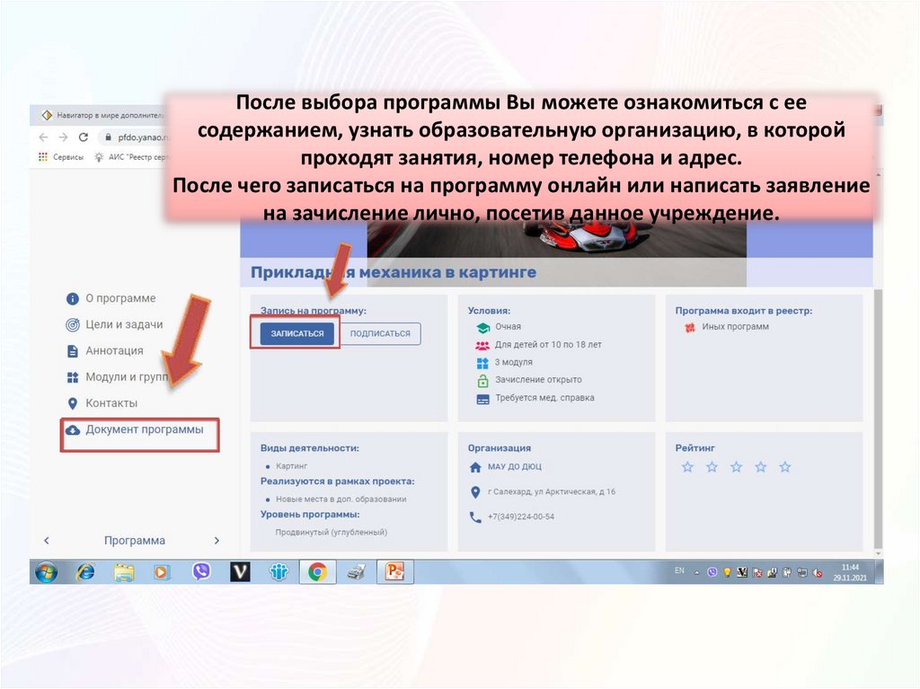 После выбора программы Вы можете ознакомиться с еесодержанием, узнать образовательную организацию, в которой