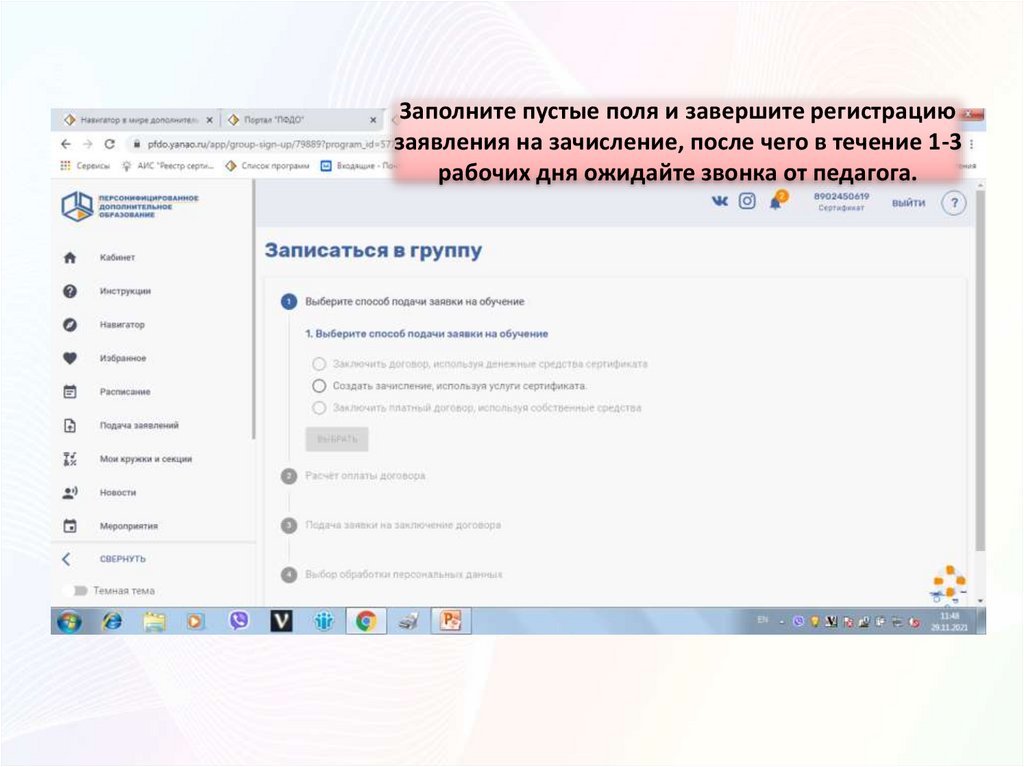 Заполните пустые поля и завершите регистрациюзаявления на зачисление, после чего в течение 1-3