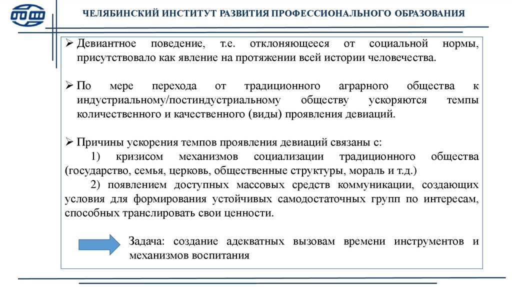 ЧЕЛЯБИНСКИЙ ИНСТИТУТ РАЗВИТИЯ ПРОФЕССИОНАЛЬНОГО ОБРАЗОВАНИЯДевиантное поведение, т.е. отклоняющееся от социальной нормы,