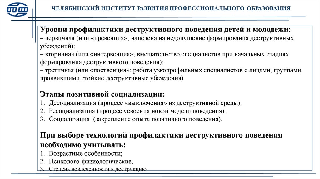 ЧЕЛЯБИНСКИЙ ИНСТИТУТ РАЗВИТИЯ ПРОФЕССИОНАЛЬНОГО ОБРАЗОВАНИЯУровни профилактики деструктивного поведения детей и молодежи: