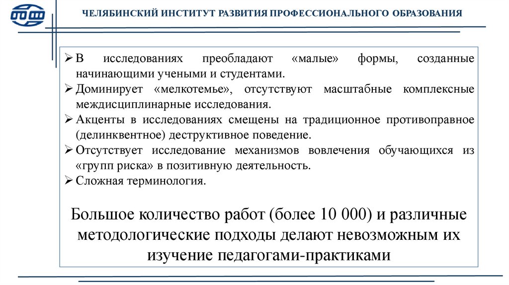 ЧЕЛЯБИНСКИЙ ИНСТИТУТ РАЗВИТИЯ ПРОФЕССИОНАЛЬНОГО ОБРАЗОВАНИЯВ исследованиях преобладают «малые» формы, созданные