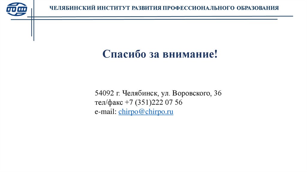 ЧЕЛЯБИНСКИЙ ИНСТИТУТ РАЗВИТИЯ ПРОФЕССИОНАЛЬНОГО ОБРАЗОВАНИЯСпасибо за внимание!