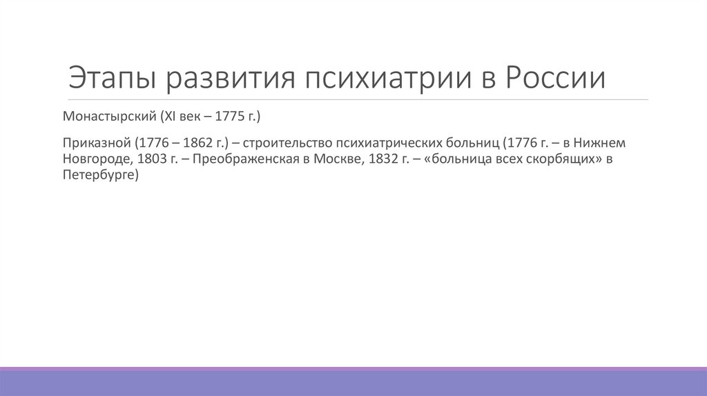 Этапы развития психиатрии в РоссииМонастырский (XI век – 1775 г.)
