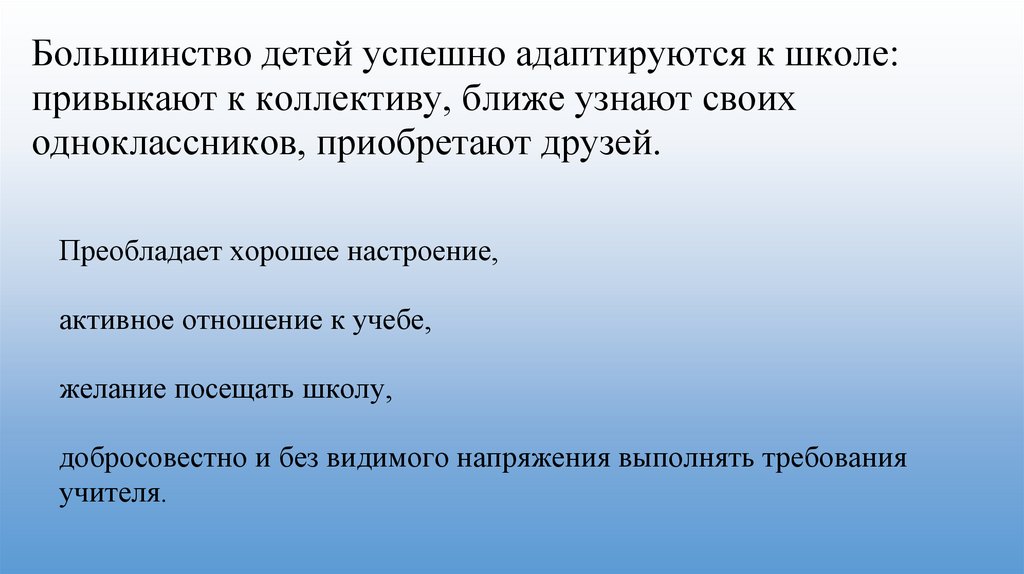 Большинство детей успешно адаптируются к школе:привыкают к коллективу, ближе узнают своих