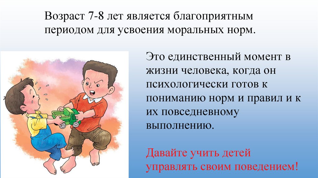 Возраст 7-8 лет является благоприятнымпериодом для усвоения моральных норм.