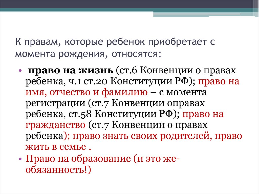 ребенка, ст.58 Конституции РФ); право на