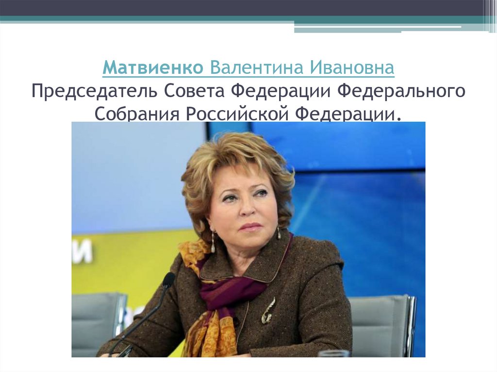 Матвиенко Валентина ИвановнаПредседатель Совета Федерации Федерального