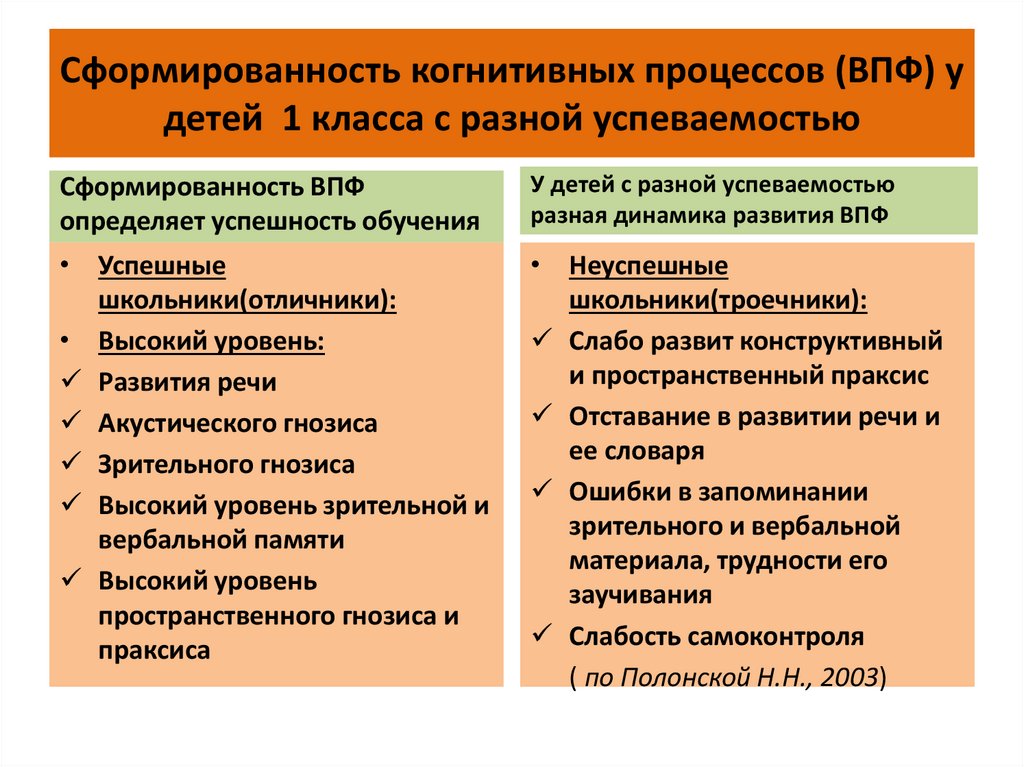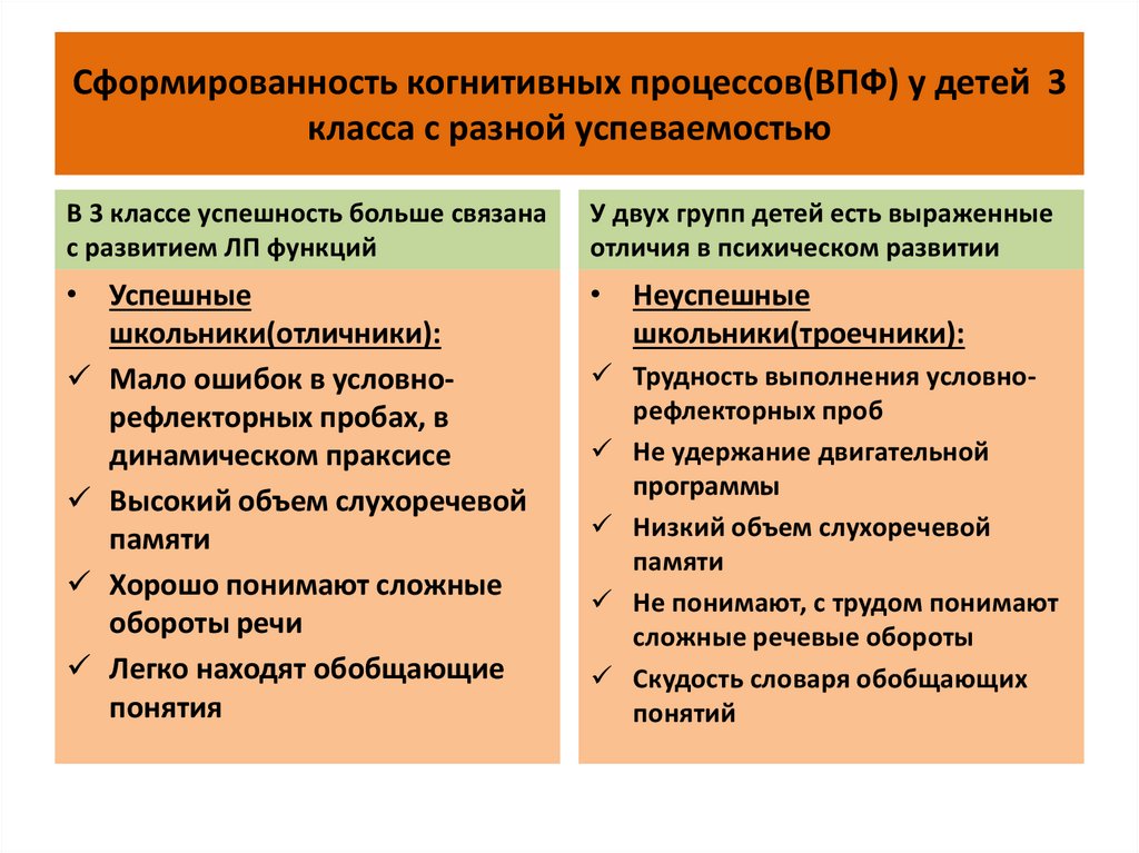 Сформированность когнитивных процессов (ВПФ) удетей 1 класса с разной успеваемостью