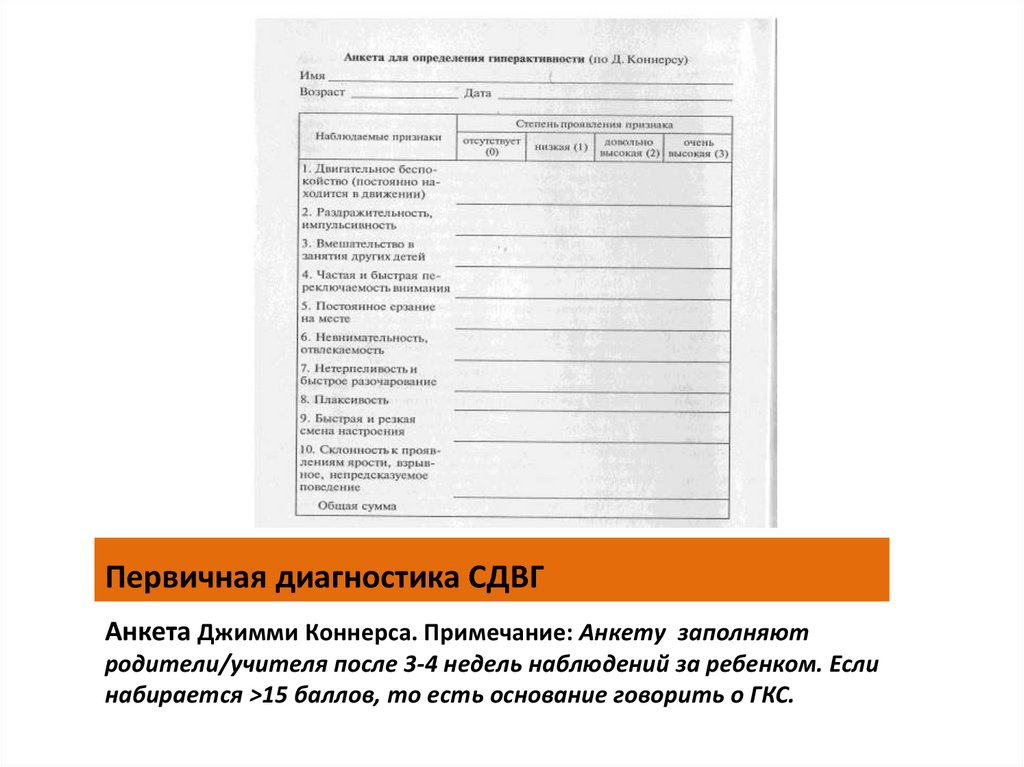 Первичная диагностика СДВГАнкета Джимми Коннерса. Примечание: Анкету заполняют