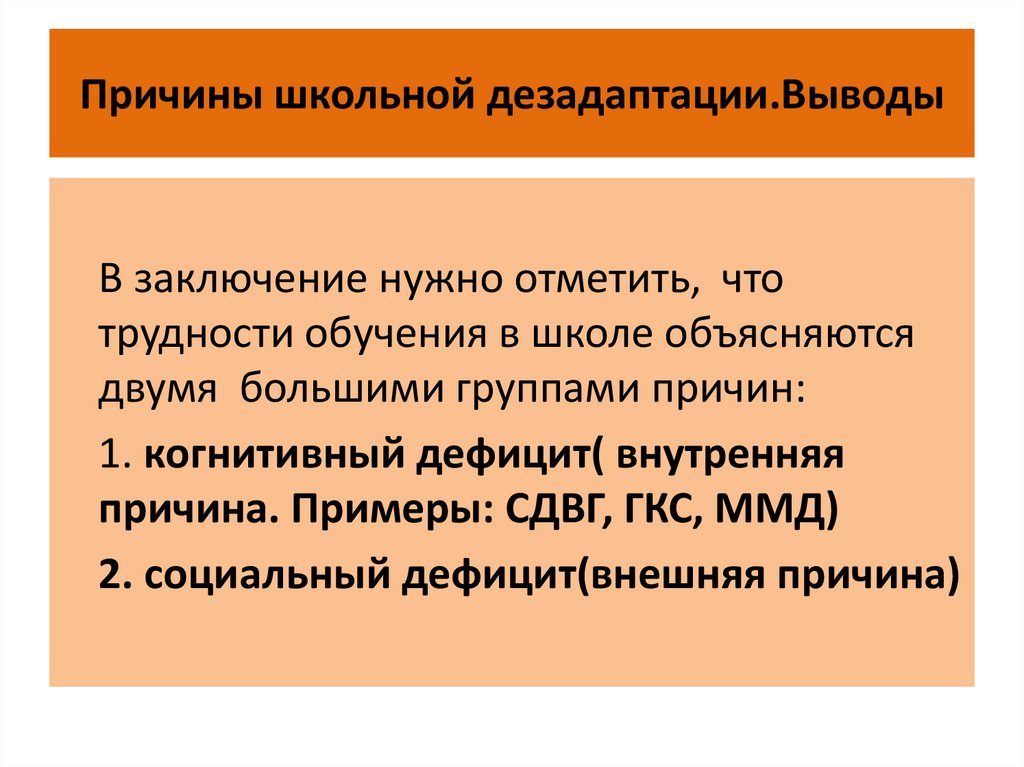 Причины школьной дезадаптации.ВыводыВ заключение нужно отметить, что
