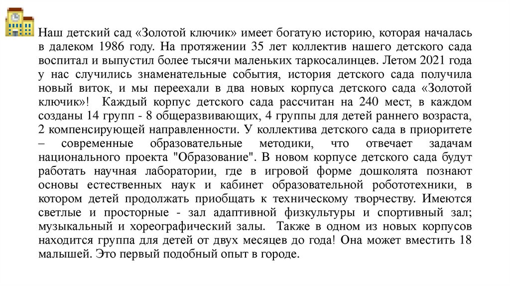 ключик»! Каждый корпус детского сада рассчитан на 240 мест, в каждом