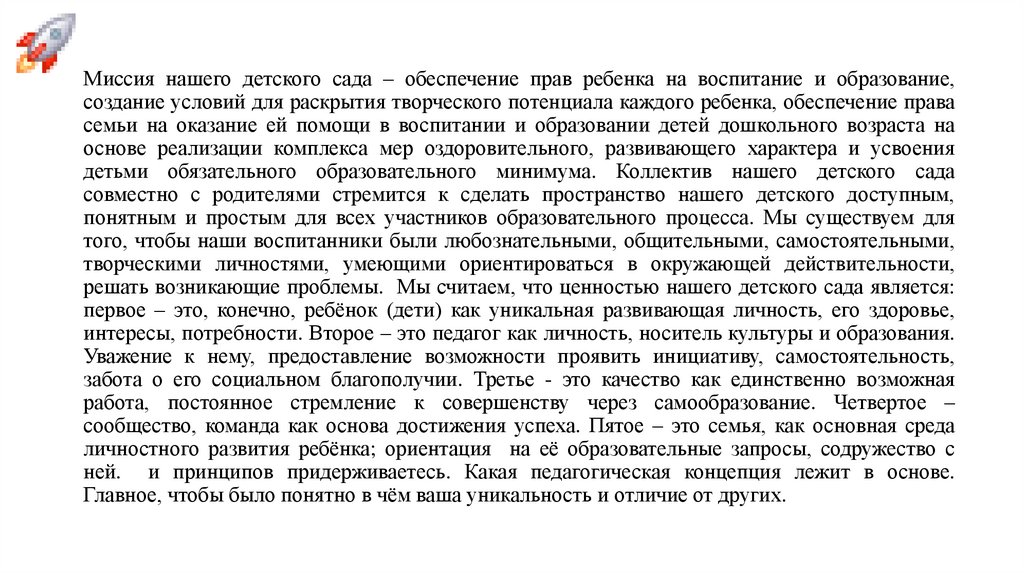 Миссия нашего детского сада – обеспечение прав ребенка на воспитание и образование,создание условий для раскрытия творческого потенциала каждого ребенка, обеспечение права