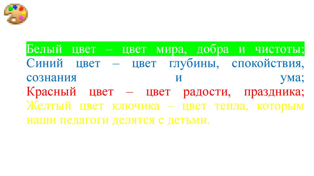 Белый цвет – цвет мира, добра и чистоты;Синий цвет – цвет глубины, спокойствия,