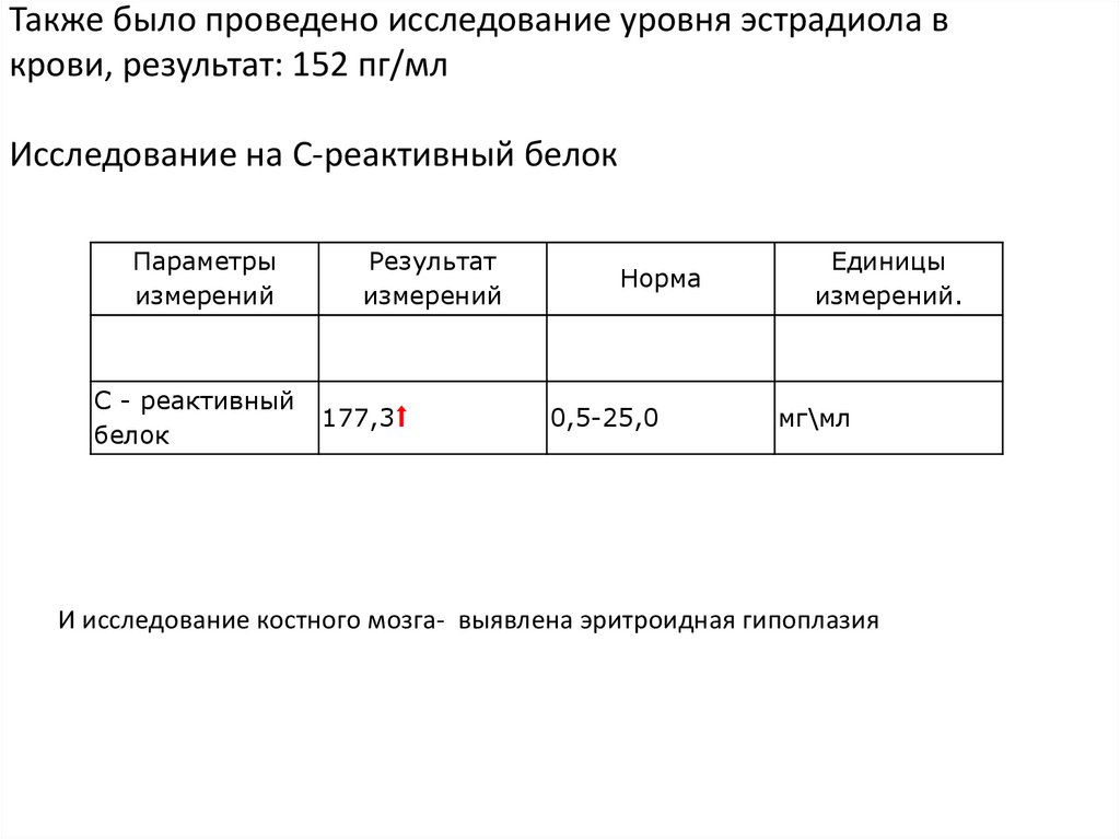 Также было проведено исследование уровня эстрадиола вкрови, результат: 152 пг/мл