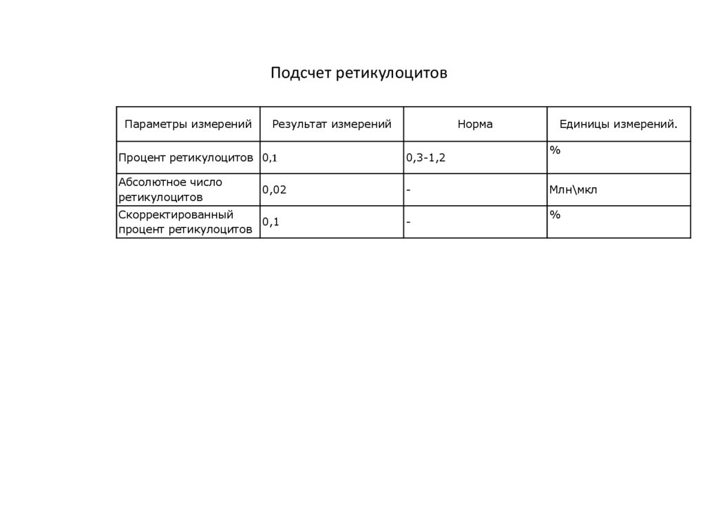 Подсчет ретикулоцитовПараметры измерений
