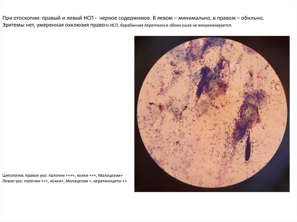 При отоскопии: правый и левый НСП - черное содержимое. В левом – минимально, в правом – обильно.Эритемы нет, умеренная окклюзия правого НСП, барабанная перепонка в обоих ушах не визуализируется.