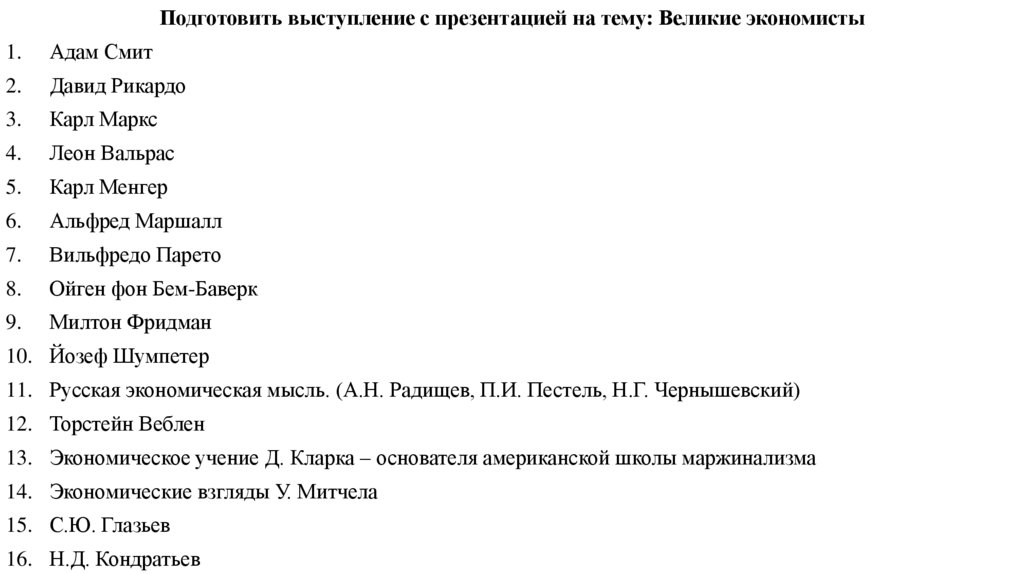 Подготовить выступление с презентацией на тему: Великие экономисты1.