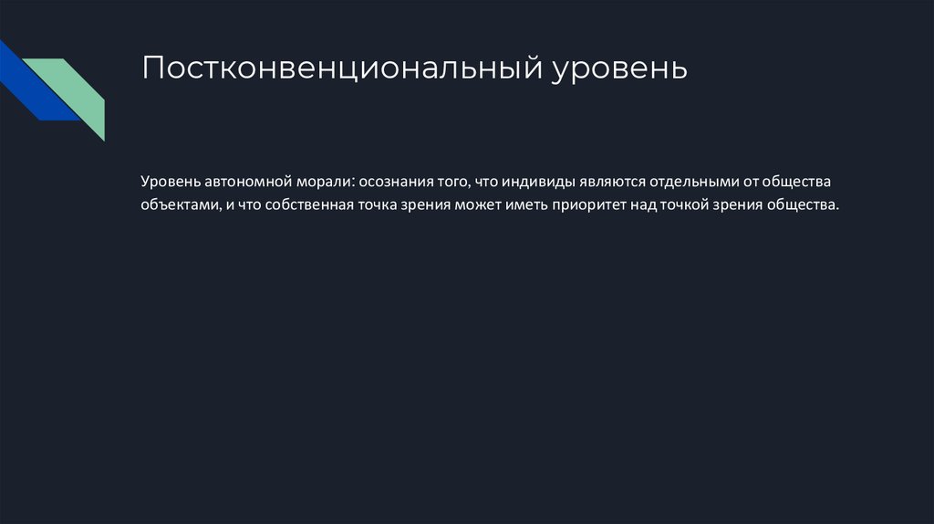 Постконвенциональный уровеньУровень автономной морали: осознания того, что индивиды являются отдельными от общества