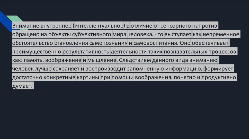 Внимание внутреннее (интеллектуальное) в отличие от сенсорного напротивобращено на объекты субъективного мира человека, что выступает как непременное