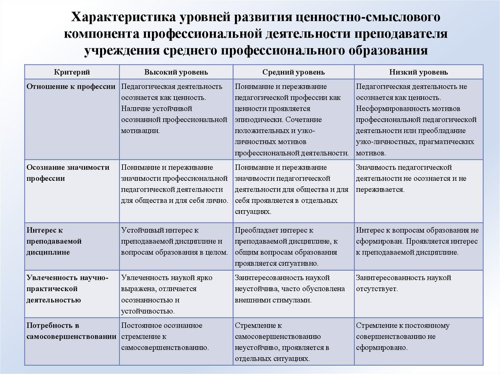 Характеристика уровней развития ценностно-смысловогокомпонента профессиональной деятельности преподавателя